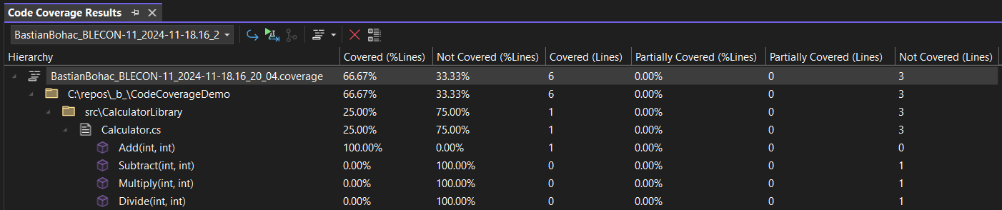Führt man dotnet-coverage wie folgt aus, wird ein neuer Test-Run gestartet und das Tool legt die Coverage-Daten in der Datei coverage.xml ab.