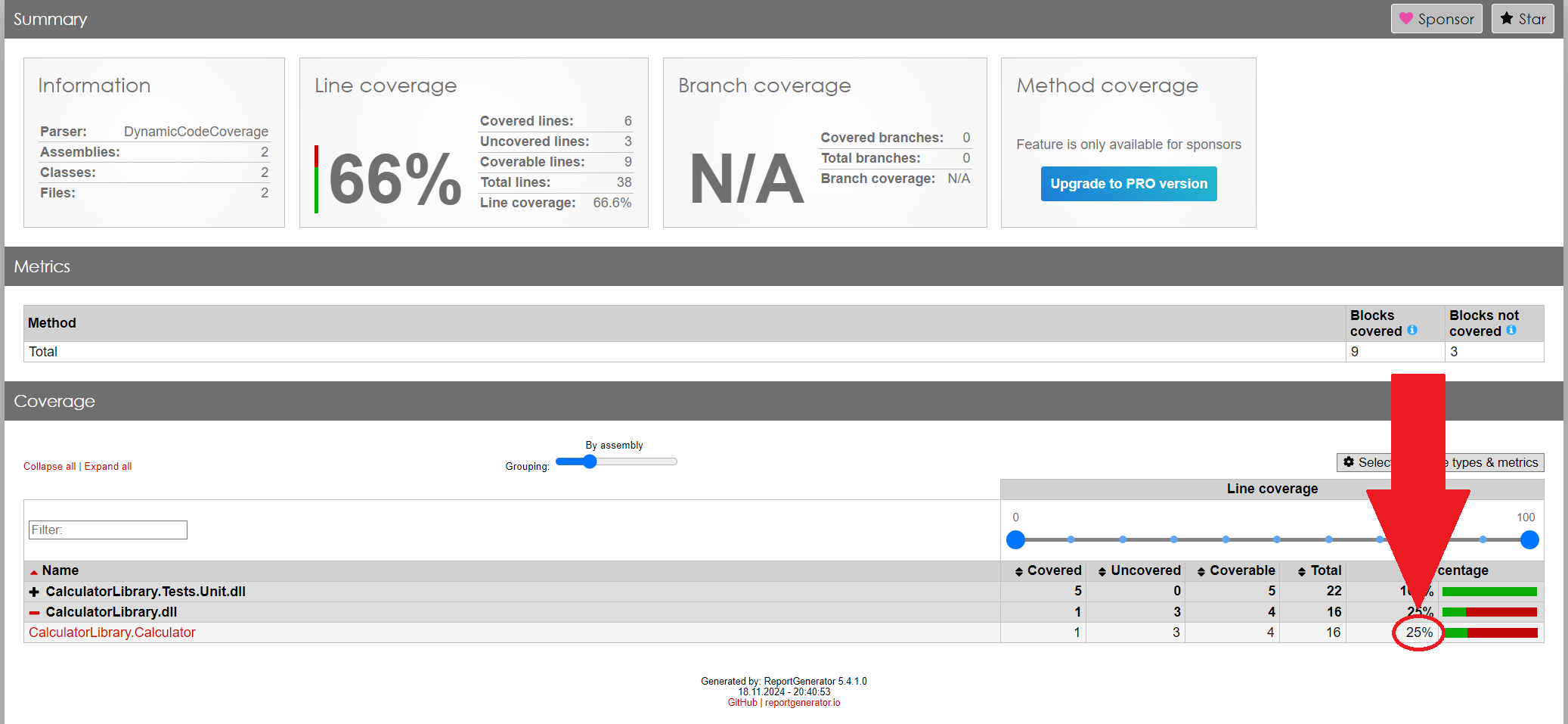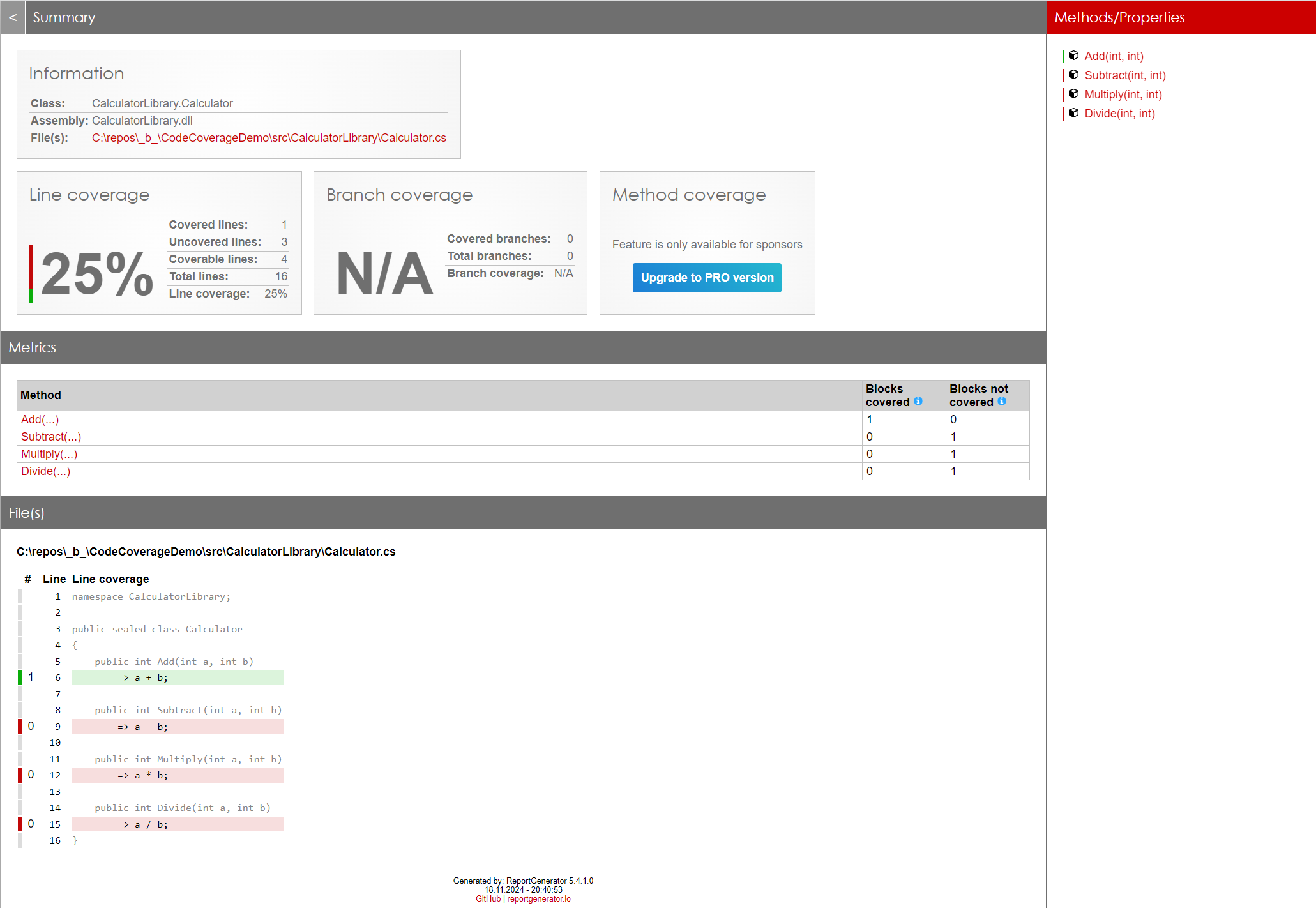 Wie im Visual Studio-Fenster kann man hier sehen, dass die Testabdeckung für CalculatorLibrary.Calculator bei mageren 25% liegt.