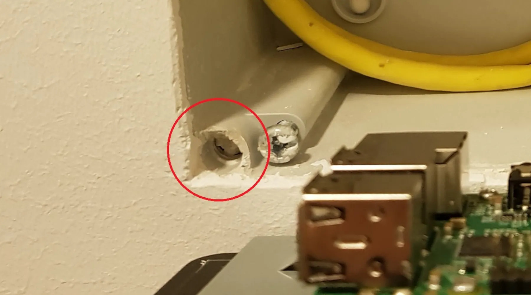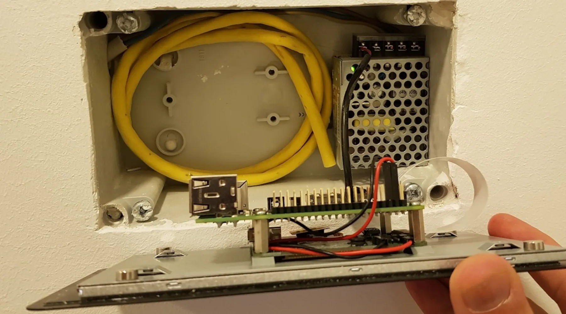 Jetzt kann das Gehäuse in die Wand eingebaut werden. Wichtig ist, dass es wirklich gerade ausgerichtet wird, da das Touch-Display später nur noch sehr wenig gedreht werden kann. Ihr solltet auch darauf achten, dass die Kabel möglichst weit hinten in das Gehäuse eingeführt werden. Ich habe dazu neue Löcher zur Kabeldurchführung gebohrt. Im nächsten Bild sieht man, dass auch noch ein Cat-7 Kabel im Gehäuse liegt, das ich aber aufgrund der guten W-Lan Erreichbarkeit nicht verwende. Ich bin mir auch nicht sicher, ob der Platz ausreicht um den Netzwerkstecker, ohne Modifikationen, einstecken zu können.