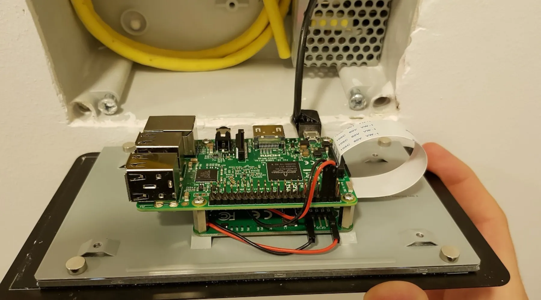 Ich verwende für den Wandeinbau das Offizielle 7 Zoll Raspberry Pi Touch-Display, da bei diesem Display das Glas auf allen Seiten etwas größer als das Metallgehäuse des Displays ist und somit bündig an der Wand anliegen kann. Der Zusammenbau des Raspberry Pi mit dem Display ist relativ einfach und auf verschiedenen Blogs gut beschrieben.